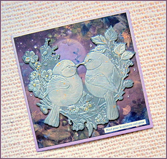 I used a Lisa Horton embossing folder die set to create this card. I cut from grey, swiped silver wax over then splattered gold over.A pretty CC paper and sentiment complete my car.